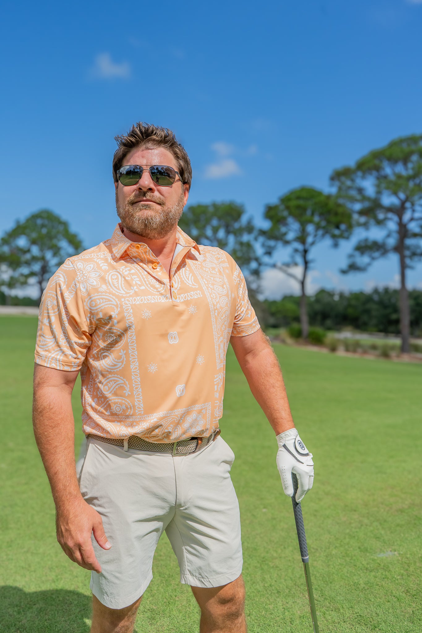 The Hidden Hanky Polo brings a fun twist to classic style with its sleek bandana pattern infused with subtle golf-inspired details. Designed for those who love the game and its culture, this playful polo blends timeless fashion with a wink to your favorite sport. Whether you're on the greens or out with friends, it’s a clever way to show your passion in a stylish, unexpected way. Comfortable and eye-catching, it’s perfect for golfers who like to keep their love of the game delightfully under wraps